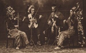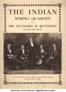 In 1916, Mr. Cardin became the first violinist of the Indian String Quartet, a group formed by the Indianist composer Ruthyn Turney. The string quartet was comprised of members, each with Native American affiliation: the second violinist was Alex Melodivov of the Aleut tribe in Alaska, the violist was William Palin of the Flathead tribe in Montana, and the cellist was William Reddie of the Hydah tribe in Alaska. Much like Fred Cardin’s individual concerts, the program was often divided in half: first, the classical selections performed in tuxedos, and second, the Native American compositions performed in traditional Native American regalia, thus merging traditional European repertoire with Indian-inspired aesthetics through quartet arrangements of Native American melodies. ii The Indian String Quartet was often featured on the Chautauqua Circuit, a traveling event to bring education and culture to the greater public. iii