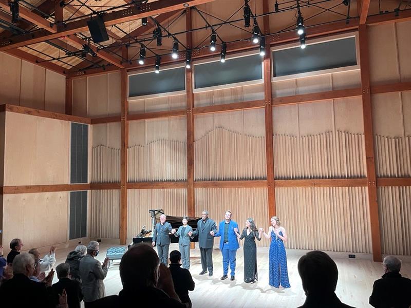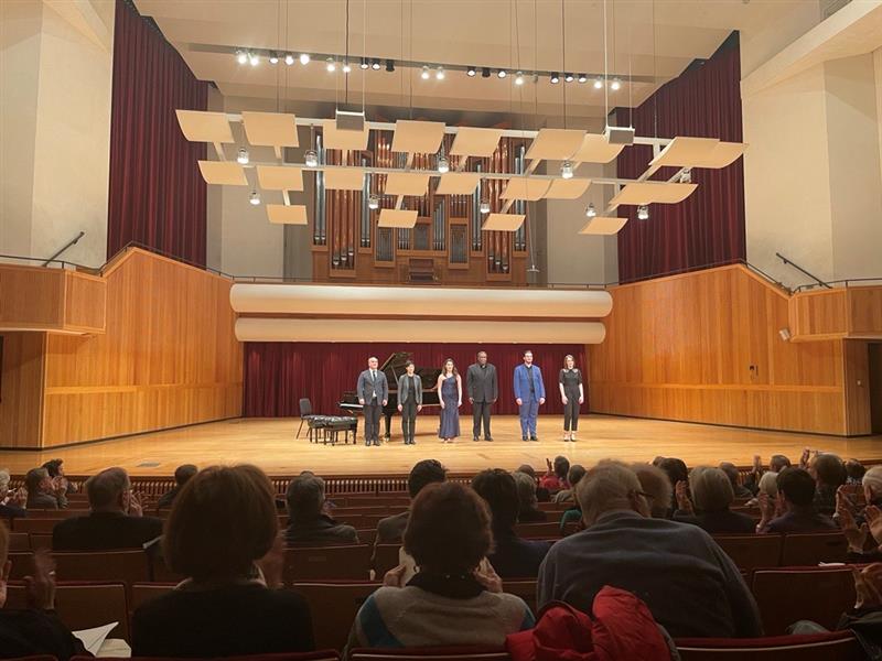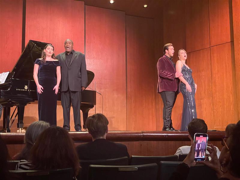 Curtis On Tour recently presented renowned bass-baritone Eric Owens (Opera ’95) alongside soprano Sarah Fleiss, mezzo-soprano Lucy Baker, and tenor Joseph Tancredi (Opera ’22)—three emerging professional artists from the Curtis Opera Theatre—for nine performances throughout the U.S. from October 13 through November 20, 2022. Joined by pianists Miloš Repický (Hirsig Family Chair in Vocal Studies, Principal Opera Coach) and Ting Ting Wong, these talented young singers shared the stage with their mentor, Eric Owens, Curtis’s Director of Vocal Studies and Curtis Opera Theatre, for a delightful program featuring Brahms’s lilting and pensive Neue Liebeslieder Waltzer for four voices and four-hand piano. The set also included performances of works by Brahms, Schubert, Lerner & Loewe, and gems of the operatic repertoire.